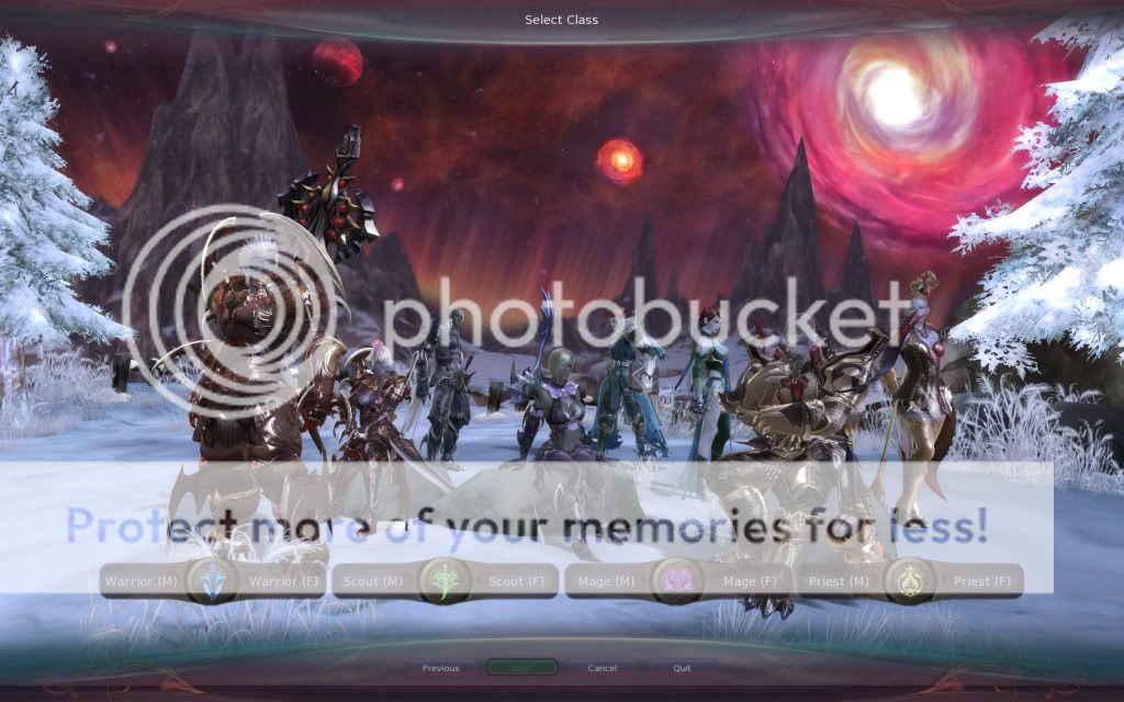 Upon choosing your faction you'll be greeted with the class selection screen. As I mentioned last entry, there are four base classes that expand to eight advanced classes. Upon hitting level 10 you're given the choice (after an ingame event) of which of your base class's two advanced classes you wish to become. From then on you are that advanced class.